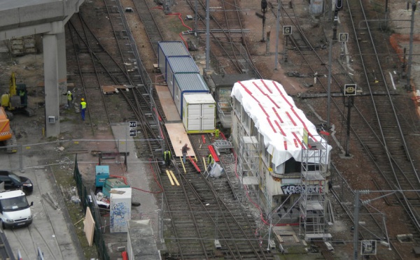 Jacques Gauthier continue ses visites discrètes de l'aberrant chantier du tram. Un reportage à haut risque, une exclusivité du Delanopolis. La photo ci-contre représente le poste d'aiguillage CFC ( cliquez ici ) de la porte d'Aubervilliers "écrêté " car trop haut pour le passage du futur tablier du pont-route qui le recouvrira...