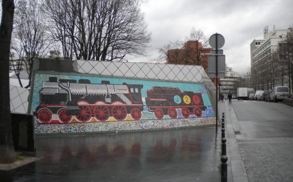Performance : Jacques Gauthier nous fait un petit couplet à la fois nostalgique et prospectif sur la place de la loco à Paris. La photo ci-contre est celle d'une mosaïque réalisée par les animateurs et enfants du centre socio-culturel J2P implanté rue Petit (19ème).