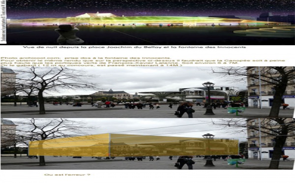 Le scandale du réaménagement des Halles est désormais de notoriété publique : jardin misérable, Canopée massive, hideuse et ruineuse et intérêt général bradé au groupe Unibail. Trois témoignages supplémentaires cette semaine. D'abord, sur le site Archicool, une confirmation par le petit photomontage ci-contre, simple mais...