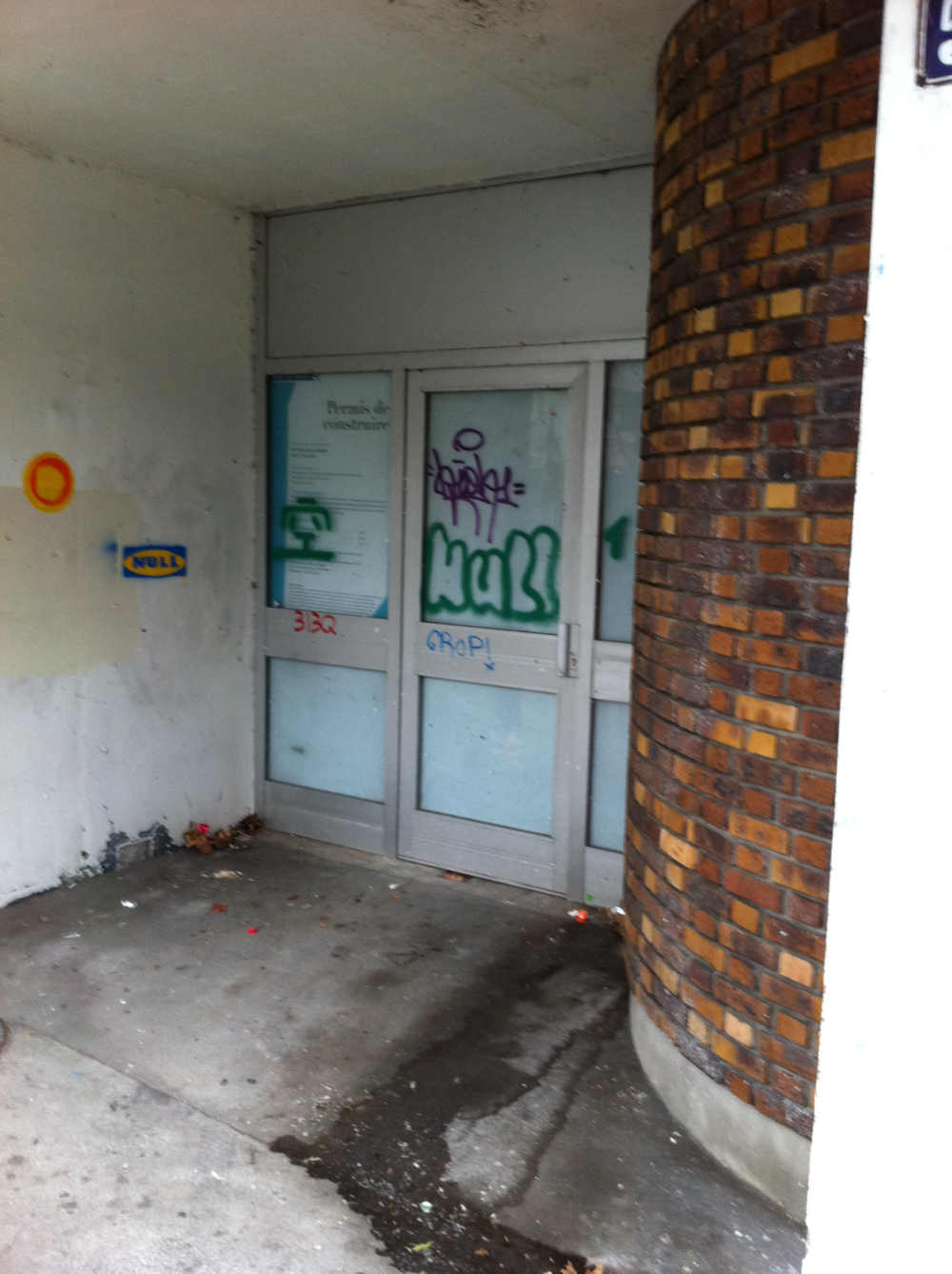 un trottoir qui n’a jamais été rebouché, un dépotoir, un bâtiment qui manque de fraicheur, un plot délabré devant une banque, des quilles usées à la corde, des blocs de béton devant la façade, des zones de dépotoirs et de tags en tous genres.